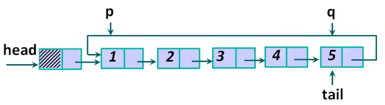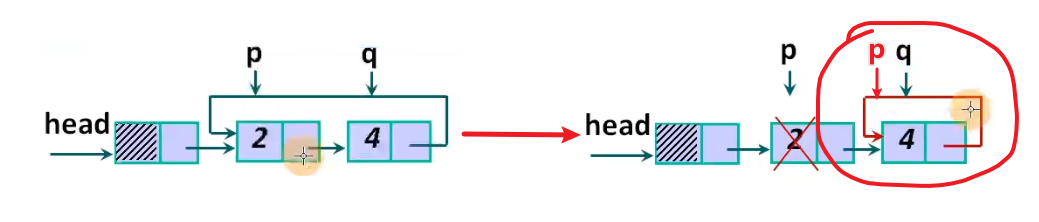 head->next = q;, 或者head->next = p;- 需要特别注意最后一个节点被删除后, 要将头节点的 next 指针置为 NULL , 否则可能会导致内存访问越界等问题。如图:
