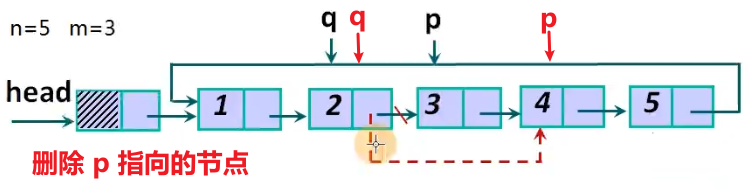i = m时, 即报数达到 m ,删除 p 指向的节点,将 q 的下一个节点指向 p 的下一个节点。- 当